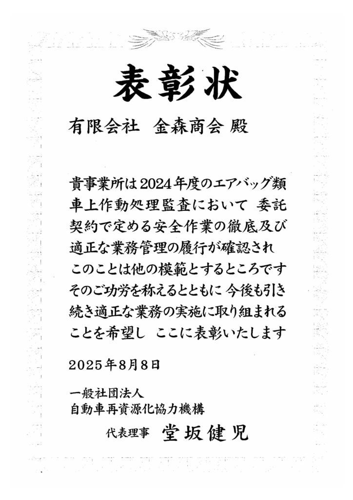 【表彰】エアバック車上作動 適正処理 2025年8月20日 admin_kparts エアバック類車上作動処理における適正処理事業所として表彰状を頂きました。大変身の引き締まる思いですが、今後も引き続き安全・適切な処理の上、再資源化を進めて参ります。