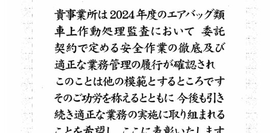 ブログ 2025年8月20日 【表彰】エアバック車上作動 適正処理 エアバック類車上作動処理における適正処理事業所として表彰状を頂きました。大変身の 「【表彰】エアバック車上作動 適正処理」の続きを読む